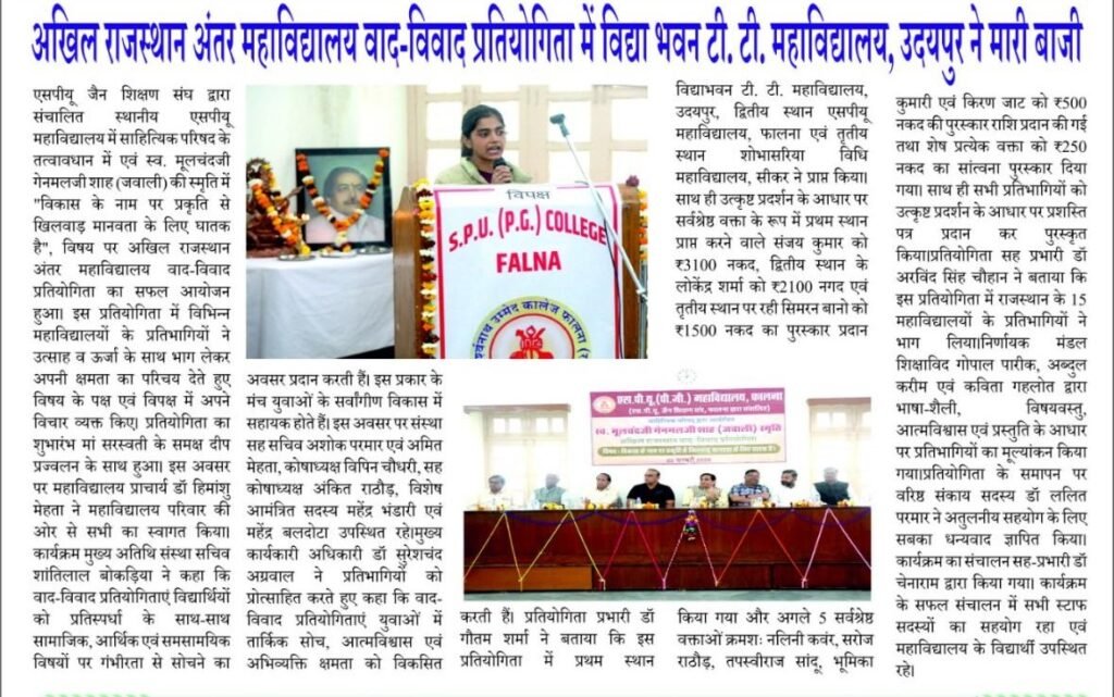अखिल राजस्थान अंतर महाविद्यालय वाद-विवाद प्रतियोगिता में विद्या भवन टी. टी. महाविद्यालय, उदयपुर ने मारी बाजीFebruary 4, 2026category:NewsTag: