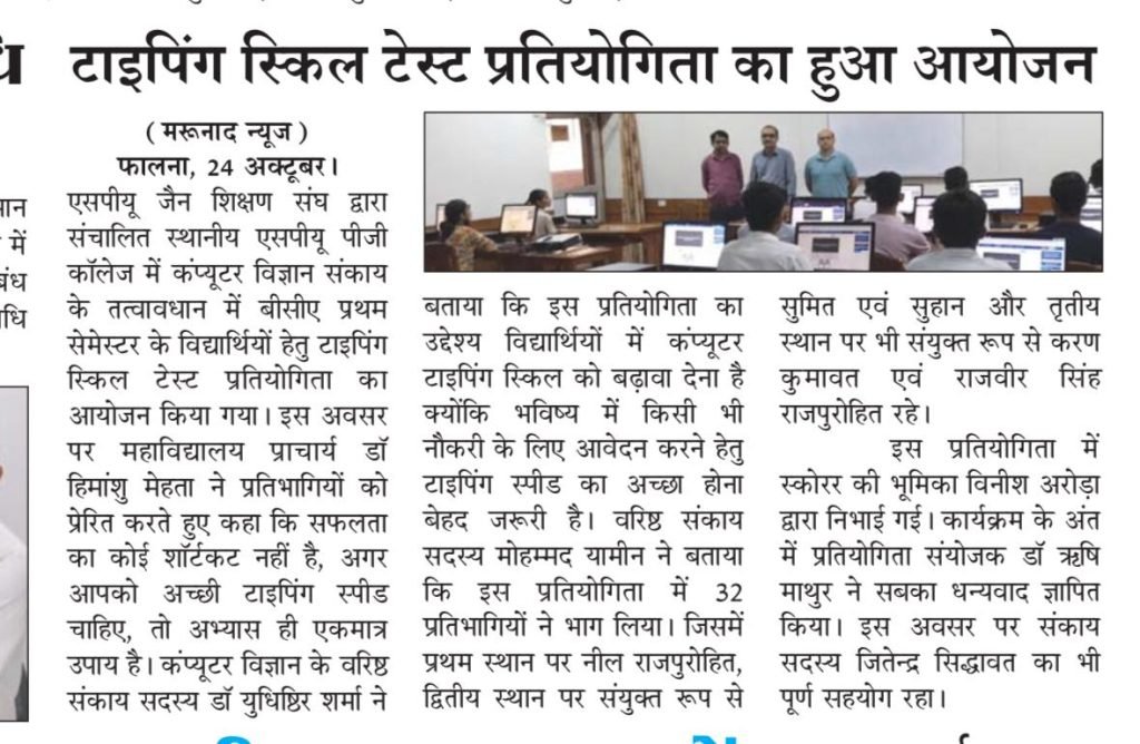 एसपीयू जैन शिक्षण संघ द्वारा संचालित स्थानीय एसपीयू पीजी कॉलेज में कंप्यूटर विज्ञान संकाय के तत्वावधान में बीसीए प्रथम सेमेस्टर के विद्यार्थियों हेतु टाइपिंग स्किल टेस्ट प्रतियोगिता का आयोजन किया गया। इस अवसर पर महाविद्यालय प्राचार्य डॉ हिमांशु मेहता ने प्रतिभागियों को प्रेरित करते हुए कहा कि सफलता का कोई शॉर्टकट नहीं है, अगर आपको अच्छी टाइपिंग स्पीड चाहिए, तो अभ्यास ही एकमात्र उपाय है। कंप्यूटर विज्ञान के वरिष्ठ संकाय सदस्य डॉ युधिष्ठिर शर्मा ने बताया कि इस प्रतियोगिता का उद्देश्य विद्यार्थियों में कंप्यूटर टाइपिंग स्किल को बढ़ावा देना है क्योंकि भविष्य में किसी भी नौकरी के लिए आवेदन करने हेतु टाइपिंग स्पीड का अच्छा होना बेहद जरूरी है। वरिष्ठ संकाय सदस्य मोहम्मद यामीन ने बताया कि इस प्रतियोगिता में 32 प्रतिभागियों ने भाग लिया। जिसमें प्रथम स्थान पर नील राजपुरोहित, द्वितीय स्थान पर संयुक्त रूप से सुमित एवं सुहान और तृतीय स्थान पर भी संयुक्त रूप से करण कुमावत एवं राजवीर सिंह राजपुरोहित रहे। इस प्रतियोगिता में स्कोरर की भूमिका विनीश अरोड़ा द्वारा निभाई गई। कार्यक्रम के अंत में प्रतियोगिता संयोजक डॉ ऋषि माथुर ने सबका धन्यवाद ज्ञापित किया। इस अवसर पर संकाय सदस्य जितेंद्र सिद्धावत का भी पूर्ण सहयोग रहा।