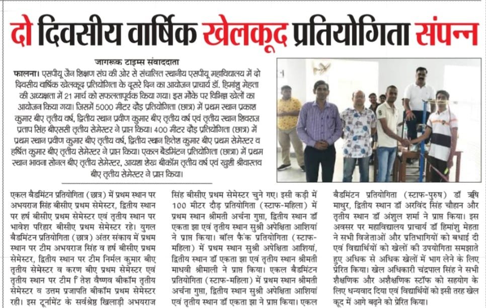 S.P.U. (P.G.) College , Falna is a Prime Higher Education Institution not only in the Jodhpur Division, but also in the State of Rajasthan . This College is a part of SHRI PARSHWANATH UMMED JAIN SHIKSHAN SANGH, FALNA, The Leading Educational Institution in Gaurwar Region.