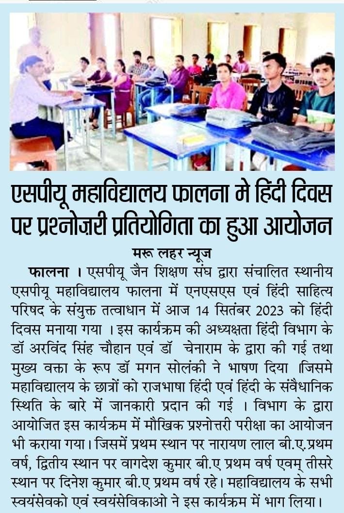 S.P.U. (P.G.) College , Falna is a Prime Higher Education Institution not only in the Jodhpur Division, but also in the State of Rajasthan . This College is a part of SHRI PARSHWANATH UMMED JAIN SHIKSHAN SANGH, FALNA, The Leading Educational Institution in Gaurwar Region.
